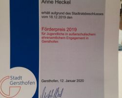 Im Rahmen des Bürgerempfanges der Stadt Gersthofen am 12. Januar wurde erstmalig ein Förderpreis für Jugendliche unter 21 Jahren verliehen, die sich außerschulisch ehrenamtlich besonders engagieren.