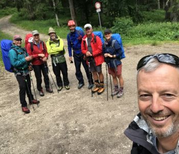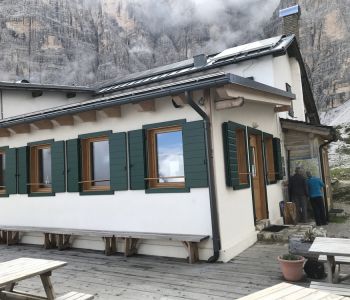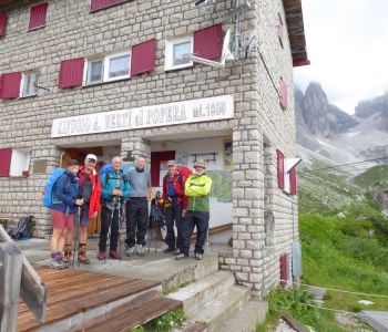 Am Dienstag, 28. Juni war Anfahrtstag. 7 SuWler machten sich morgens auf den Weg nach Südtirol. Nachmittags am Wanderparkplatz unterhalb Rifugio Lunelli angekommen setzte leider Regen ein. Der begleitete uns dann auch weitgehend beim Aufstieg zur ersten Nachtstation, der Hütte Rifugio Berti, wo wir teilweise leicht durchnässt ankamen. Mitte der Woche war dort noch wenig Betrieb und es blieb vor und nach dem Essen Zeit für Small Talk mit dem Wirt.