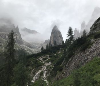 Am ersten Tourentag wurden wir früh von Gewitter geweckt, das dann leider auch absolut nicht nachgelassen hat. Da an diesem Tag die längste und schwierigste Klettersteigstrecke anstand und zur nächsten Hütte auch kein Alternativweg möglich war musste wohl oder übel umgeplant werden. Wir sind daher nach dem leckeren Frühstück wieder abgestiegen und mussten uns in ein anderes Tal – das Fischleintal – fahren lassen.