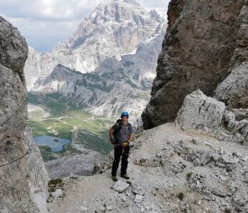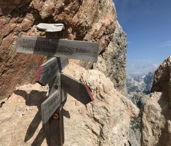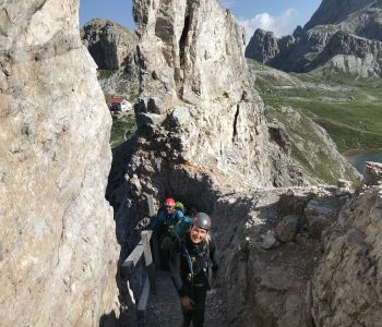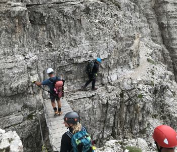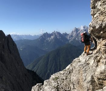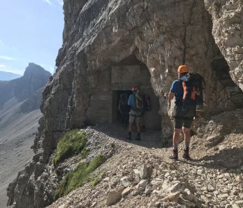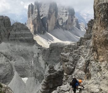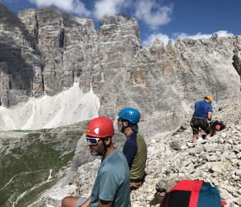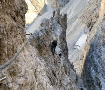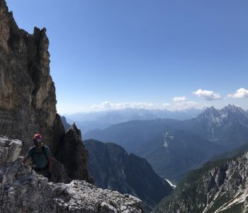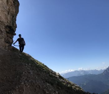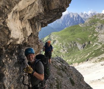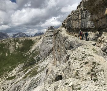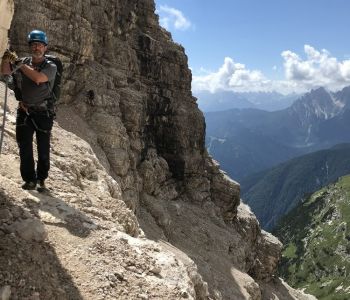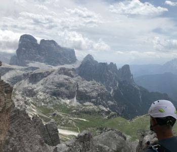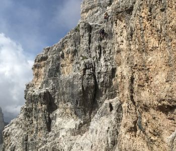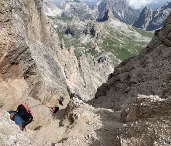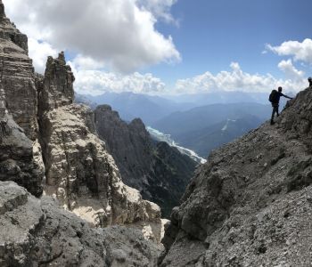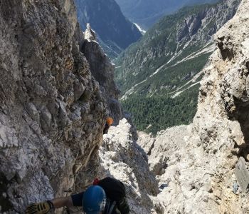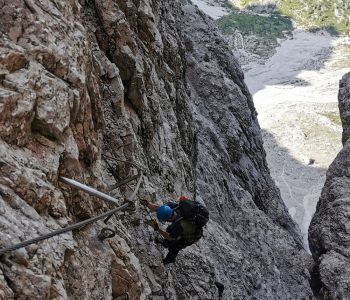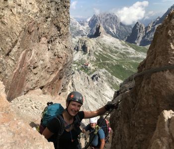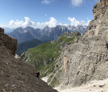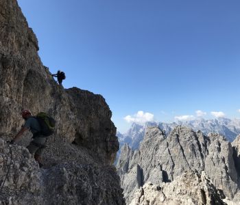 Zur zweiten Tagestour hat das Wetter dann besser mitgespielt: schon morgens Sonne und erst am Nachmittag etwas Regen. Gleich in der Nähe der Hütte begann der erste Klettersteig namens „Croda Dei Toni“, der entlang des Zwölferkofels einige Stunden dauert und dabei außerordentlich tolle Aussichten bietet. Er endet am alten roten Biwak „Toni“.