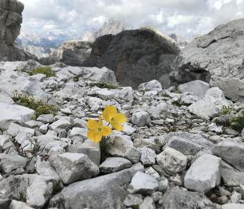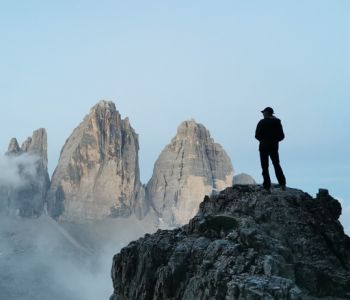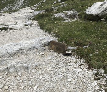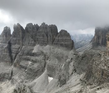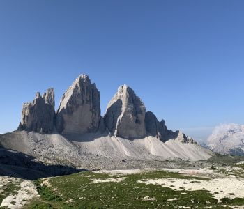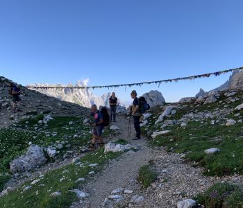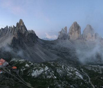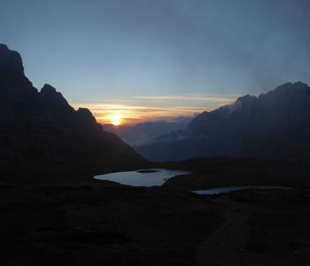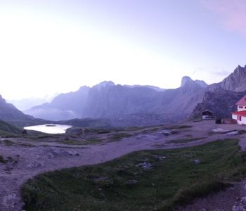 Am dritten Tag wollten wir einen tollen Sonnenaufgang bei den Drei Zinnen erleben. Daher hat der Wecker um halb 5 geklingelt. Wir sind nördlich der Hütte ein wenig hoch gestiegen, doch morgendliche Wolken haben uns das Spektakel vermasselt. Trotzdem war es etwas Besonderes, so früh morgens die langsam erwachende Natur mit Blick auf die immer heller werdenden Dolomiten zu erleben.