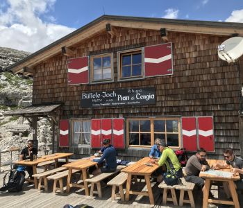 Der Steig endete unweit der schönen Büllelejochhütte, wo wir uns eine Pause verdient hatten. Die Nachmittagssonne und die Aussicht waren wunderbar und haben mindestens einen Teilnehmer zum noch längeren Verweilen veranlasst. Von dort mussten wir lediglich noch kurz zum dritten Nachtlager der Tour: der Dreizinnenhütte. Die Nachzügler hatten auf den letzten Meter noch etwas Wasser von oben, das konnte nach dem Vortag aber niemanden mehr nerven.