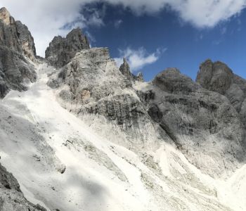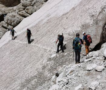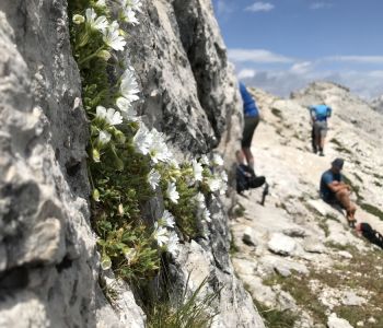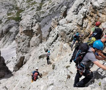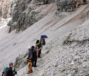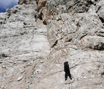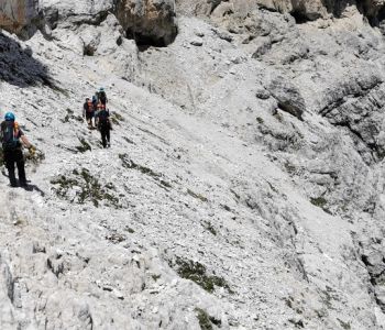 Nach einer kurzen Pause ging es vom Biwak aus weiter über weite Geröllfelder und ein Altschneefeld zum zweiten Steig des Tages, dem kürzeren Alpinisteig – einem Kriegssteig, der vor über hundert Jahren gebaut wurde.