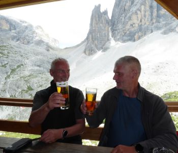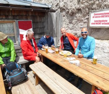 Der letzte und schwierigste, teils heikle Teil war dann schließlich der Klettersteig Aldo Roghel: er führte uns ab etwa 14:30 Uhr zuerst lange steil aufwärts um dann sofort wieder, teils mit kurzen Überhängen, noch steiler abwärts zu verlaufen. Das Ende des Klettersteiges war etwa zweieinhalb Stunden später erreicht, wobei dann immer noch der nervige, weil steile geröllige, rutschige Abstieg zur Hütte des ersten Tages vor uns lag. Die letzten kamen dort über 10 Stunden nach dem morgendlichen Aufbruch an. Nicht oft schmeckt ein kühles Bier so gut. Oder zwei 🙂