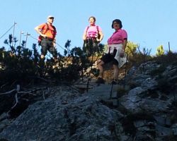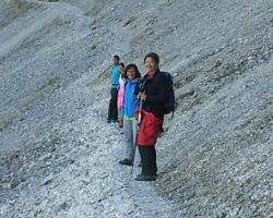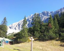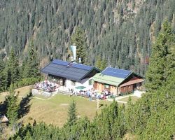 Der Weg führte durch wunderschönen Herbstwald über hochalpines Geröllfeld und aussichtsreiche Pfade ans Ziel. Die Hütte liegt unterhalb der steil abfallenden Felswand der westlichen Karwendelspitze. Wir genießen die warmen Sonnenstrahlen bei Kaffee und Kuchen.