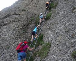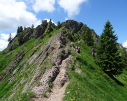 Kleine Kletterpartien sowie eine 17 Meter lange Leiter sorgten für kurzweilige Nervenkitzel bei Groß und Klein. Der Höhenweg führte die Wanderer über den Bärenkopf hinauf zum Steineberg und weiter zur Alpe Gund. Die hoch motivierte Gruppe ließ es sich nicht nehmen am Abzweig zur Alpe vorher noch den Anstieg auf den Stuiben zu nehmen.